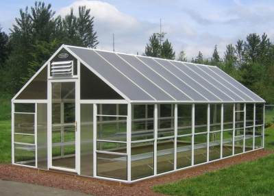 Двускатная прямоугольная теплица с крышей на две стороны - традиционная форма отдельно стоящих теплиц. Она обеспечивает прекрасное освещение даже при пасмурном небе. Классическое сооружение хорошо выглядит: строгие прямые стены и треугольный верх. У классической формы теплиц основное преимущество в сочетании полезного объема со снегоустойчивой крышей. У классического варианта все стены находятся под прямым углом к земле. Угол наклона крыши в оптимальном диапазоне около 30-40 градусов и зависит от условий освещенности и особенностей климата в регионе – чем более снежные зимы, тем больше угол наклона.